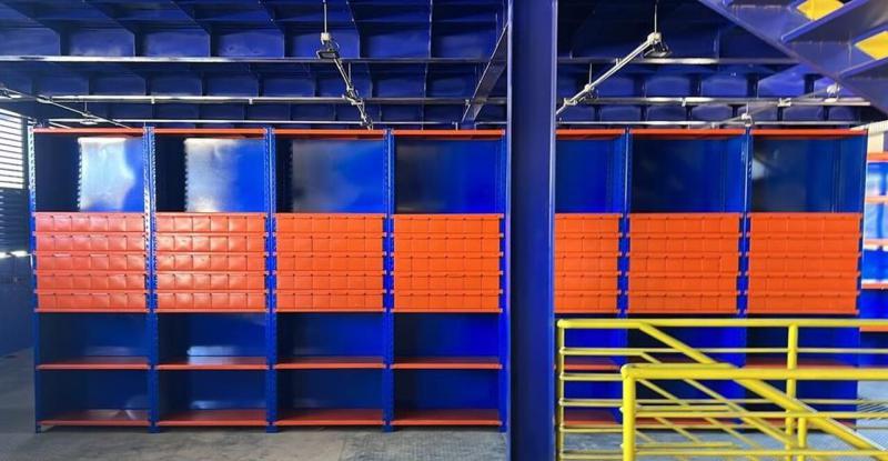 O projeto entregue para um cliente do ramo de autopeças também incluiu módulos porta paletes, escadas e divisórias, oferecendo uma solução completa e personalizada.