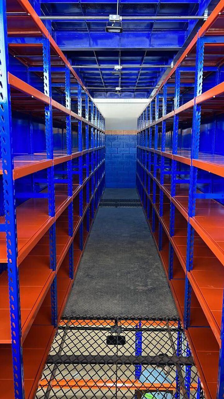 Nesta obra foram usados cerca de 100 módulos de estantes com sistema de encaixe para sustentar a estrutura metálica de aproximadamente 267 m² de entrepiso.