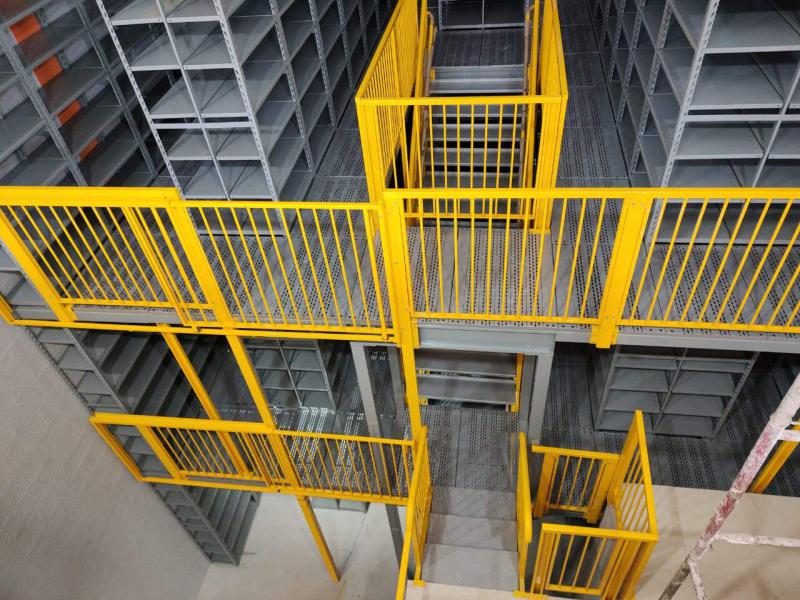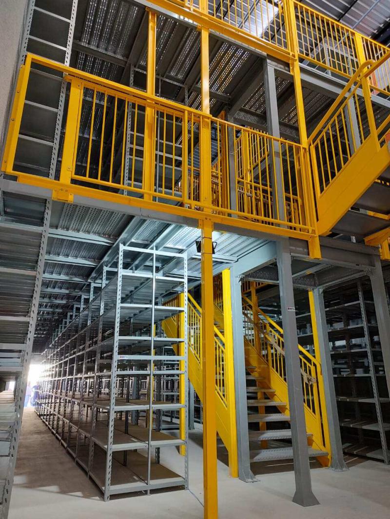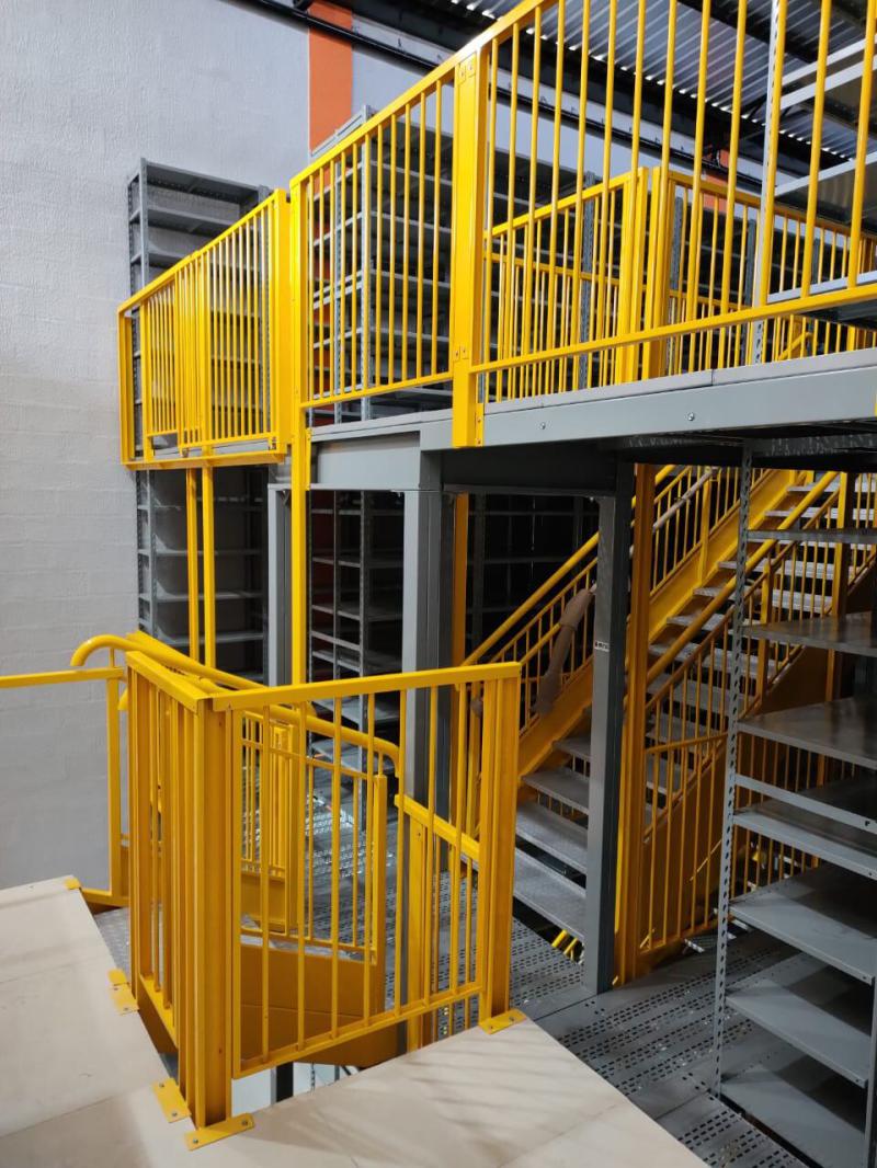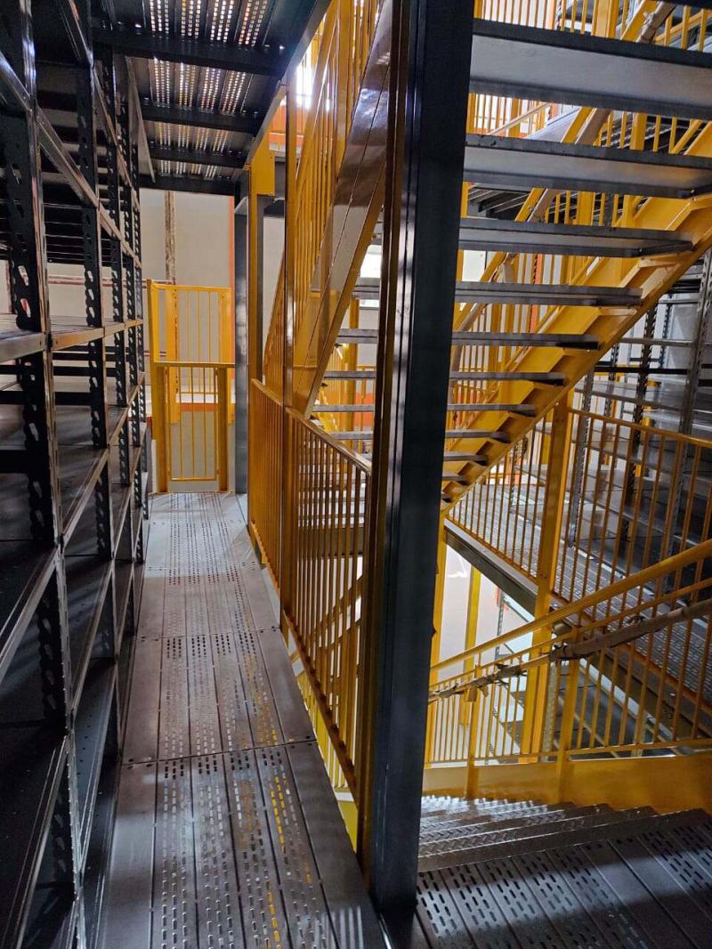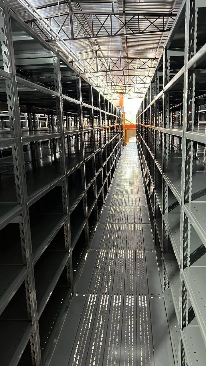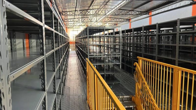 Além disso, projetamos um mezanino no início do galpão. A parte inferior é destinada ao estacionamento, enquanto a parte superior abriga as estantes.