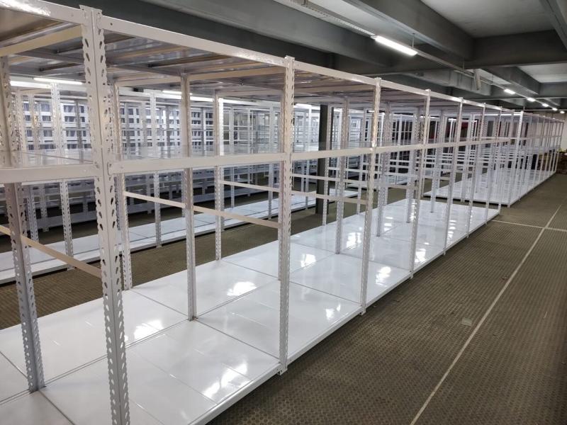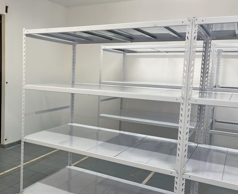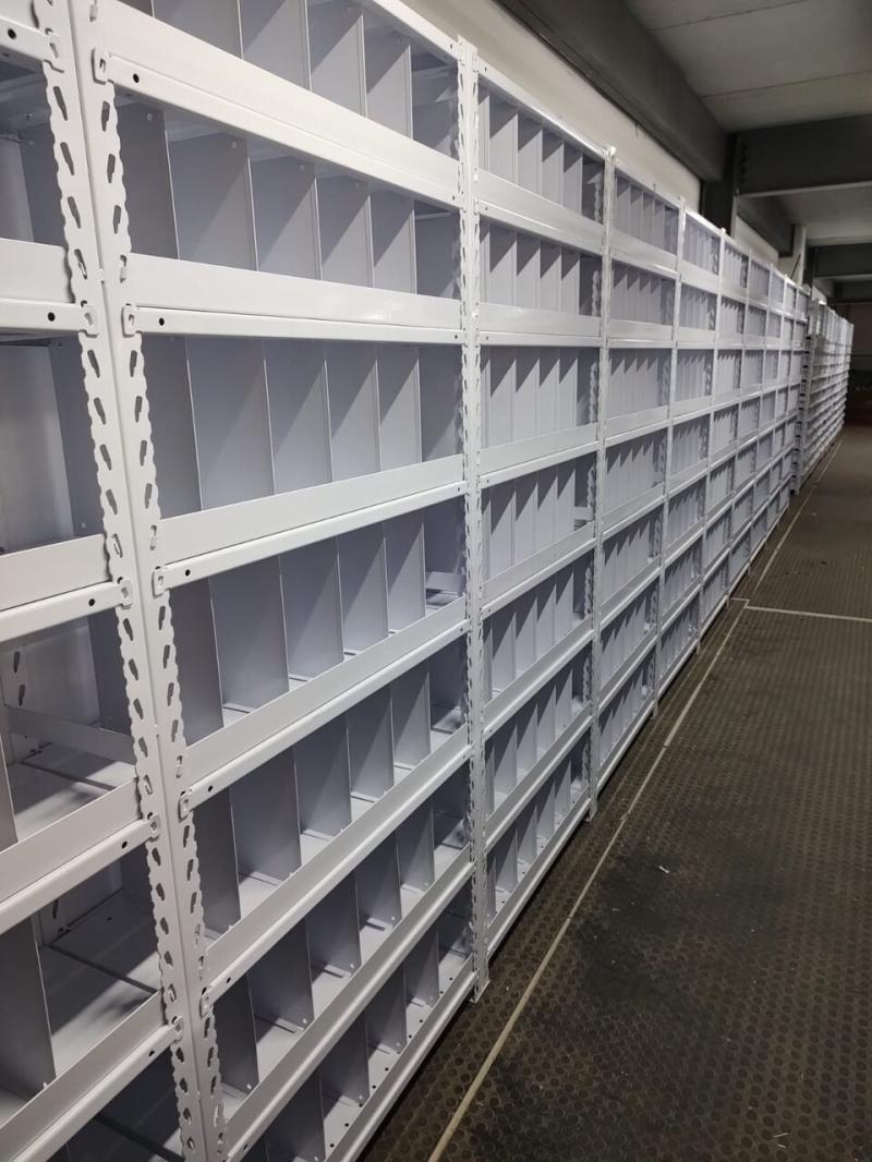 Nosso projeto contou com mais de 10 modelos de estantes, pensadas para acomodar produtos com variados volumes, pesos e alturas. Algumas estantes ganharam divisores e gavetas para otimizar a separação dos itens.