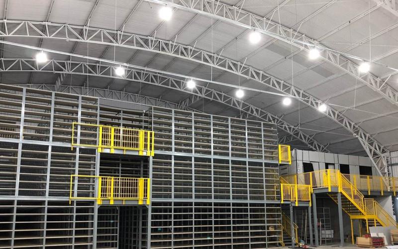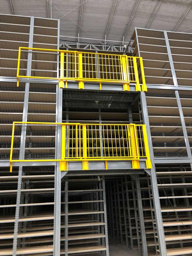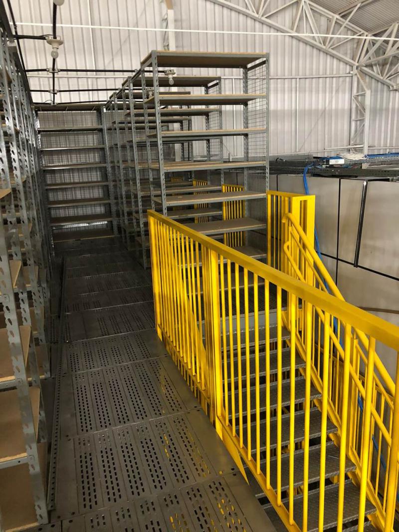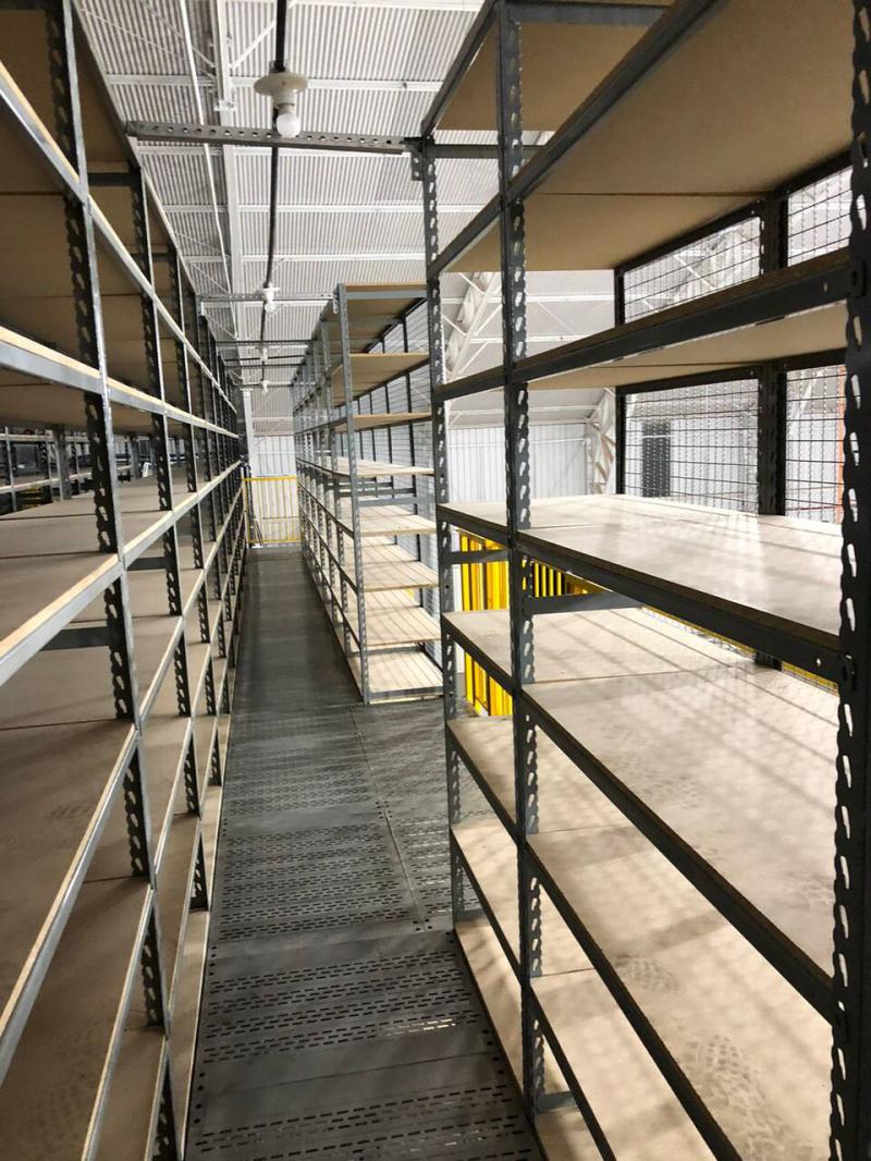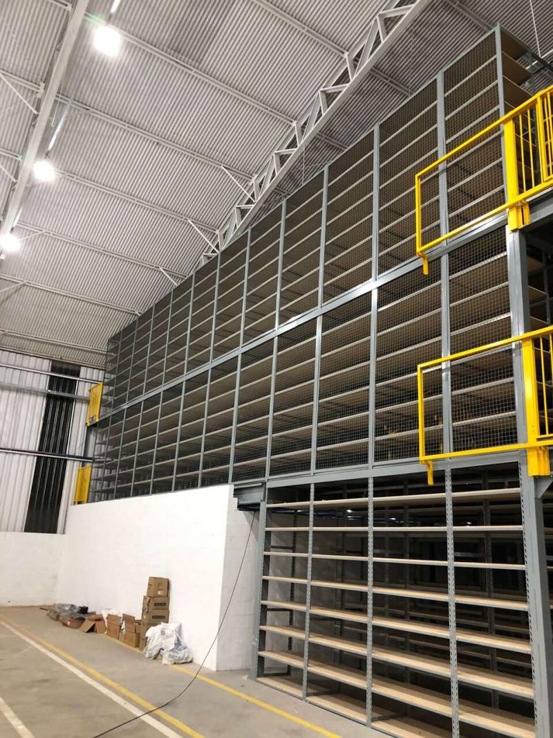 Aproveitamos ao máximo a altura do barracão, incorporando dois andares de entrepiso - uma solução que permite posicionar os pavimentos diretamente sobre as colunas das estantes, maximizando o espaço disponível.