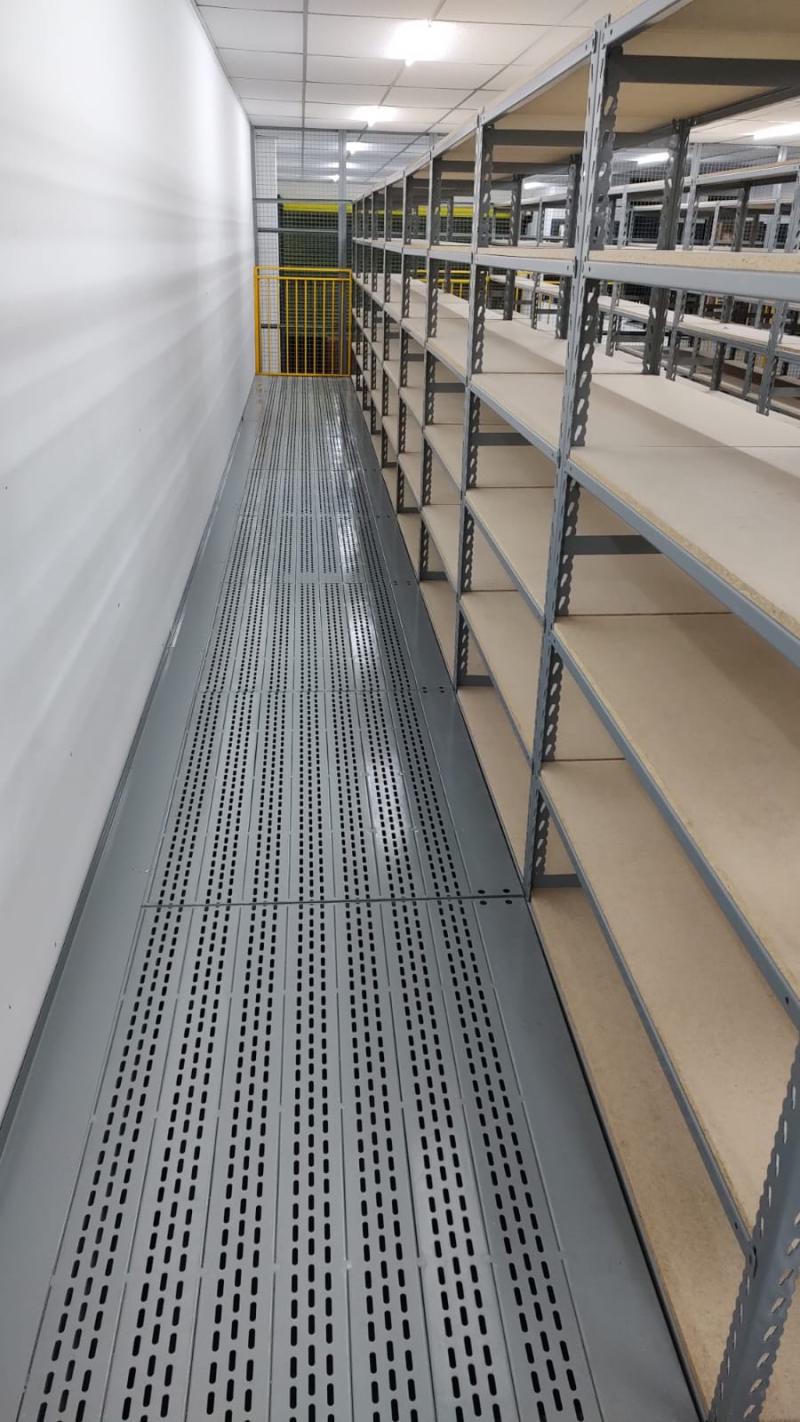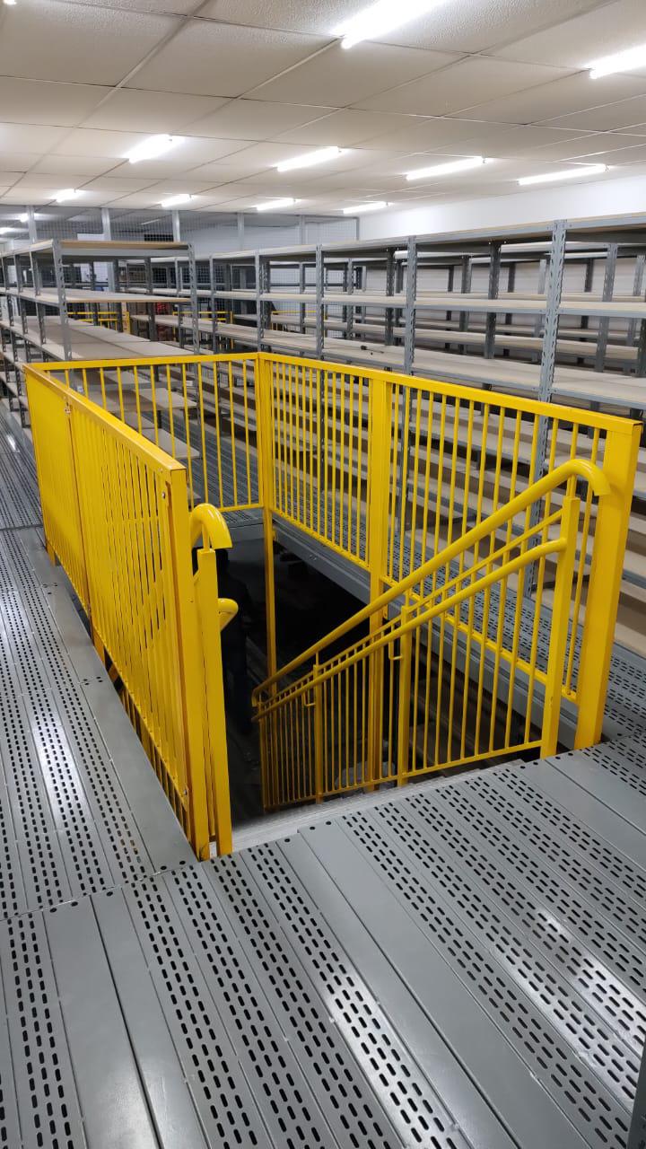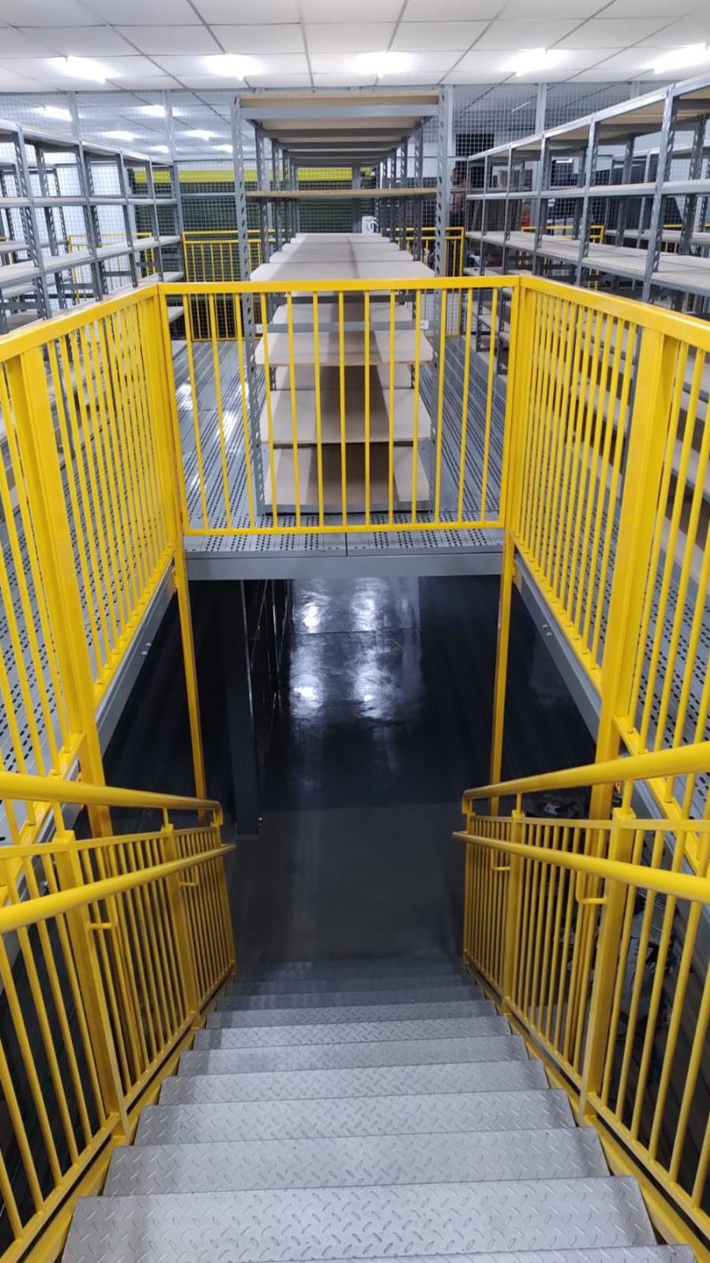 Para maximizar o uso do espaço, montamos um pavimento de entrepiso e um mezanino