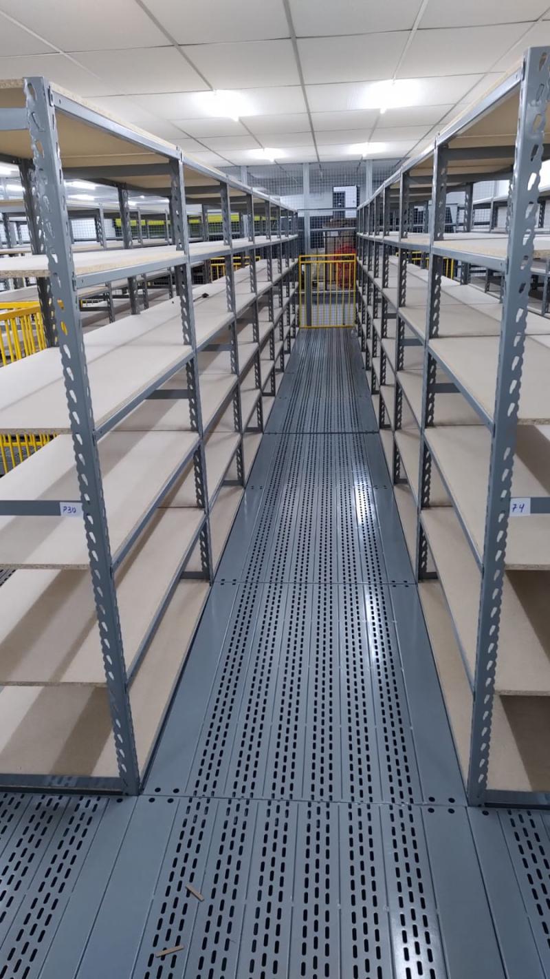 O projeto incluiu estantes de 13 modelos, módulos de mini porta paletes, divisórias e bancadas para separação, tudo seguindo o padrão exigido pela rede de lojas